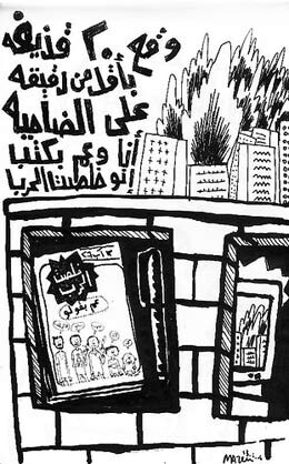 “Today’s Joke”: 20 bombs/in less than one minute/on the southern suburbs/while I am writing/that the war is over by Mazen Kerbaj. View more of his work.