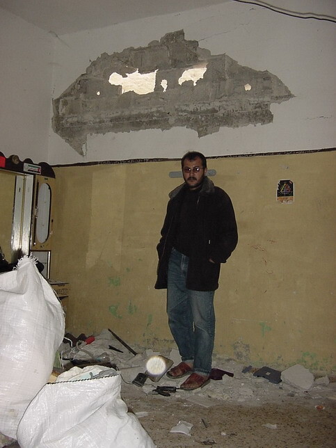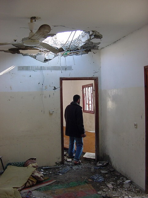 Majdi El-Athamina inside one of the apartments with damage from shells which were fired from the south. (Dr. Bill Dienst)