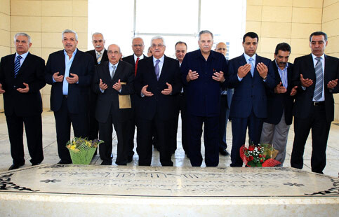 Fatah leaders, including some of those newly elected to the Fatah Central Committee, pray next to the tomb of the late Fatah leader and founder Yasser Arafat, 13 August 2009. (Omar Rashidi/MaanImages)