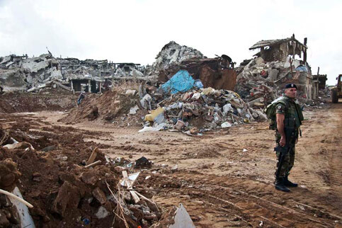 A Lebanese soldier stands near destroyed homes and shops in the Nahr al-Bared refugee camp. (Hugh Macleod/IRIN)