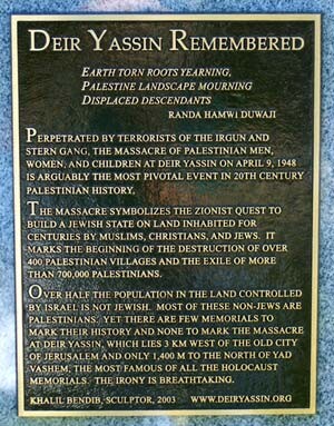 September 24, 2003 — Today, an extraordinary event will take place in Geneva, New York: the dedication of the first US memorial to the victims of the Deir Yassin massacre. This event was organized by Deir Yassin Remembered, an international human rights organization, half of whose current board includes Jews. On April 9, 1948, members of the Irgun and the Stern Gang massacred over 100 Palestinian men, women and children in the village of Deir Yassin, near Jerusalem. The Deir Yassin massacre marked the beginning of the depopulation of over 400 towns and villages, and the exodus of 750,000 Arabs; it also marked the beginning of the Palestinian Nakba, or catastrophe, and the creation of a Palestinian diaspora in refugee camps and in neighboring Arab countries. Deir Yassin Remembered executive director Dan McGowan comments. Read more about Remembering Deir Yassin