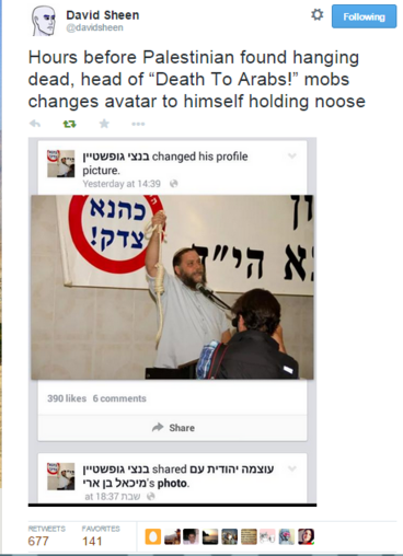 Influential Israeli settler leader called on a Palestinian political leader to be hanged just one week before Palestinian bus driver found hanged. Read more about Anti-Palestinian violence surges after Jerusalem synagogue attack