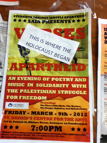 Students at the University of Ottawa say that the campus administration threatened to cancel an 8 March panel discussion they are scheduled to hold as part of Ottawa’s Israeli Apartheid. Meanwhile, at Carleton University, also in Ottawa, students found their posters defaced with slogans such as “This is where the Holocaust began.” Read more about Students react to University of Ottawa threat to cancel Israel Apartheid Week event