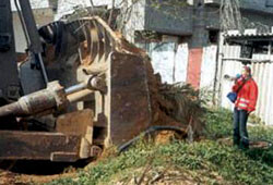Above: Rachel Corrie confronts an Israeli bulldozer earlier on the day she was killed, 16 March 2003. (Joe Smith)