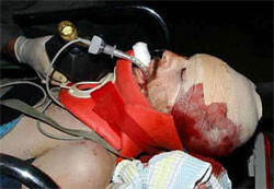 Above: Peace activist Tom Hurndall is rushed into Israel’s Soroka hospital in Beer Sheva, April 11, 2003, after he was shot and critically wounded by Israeli troops. Israeli troops shot the 21-year-old Briton as he was helping Palestinian children cross a street under gunfire Friday, fellow activists and hospital officials said. Hurndall was one of 12 members of the International Solidarity Movement (ISM) who Thursday went to the Rafah refugee camp on the Egyptian border to protest at continued Israeli shooting in the area, said ISM member Nick Smith. (Reuters)