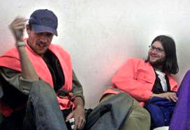 Above: British peace activist Thomas Hurndall, left, sits on the floor of a home with fellow activist Joseph Smith, minutes before they left to participate in a protest at which Hurndall suffered a gunshot wound to the head, in Rafah, southern Gaza Strip, Friday, April 11, 2003. (AP Photo/Khalil Hamra)