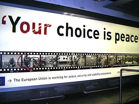 Official EU propaganda on display at Dublin airport claims that the “European Union is working for peace, security and stability everywhere.” (Image: Ali Abunimah/EI)