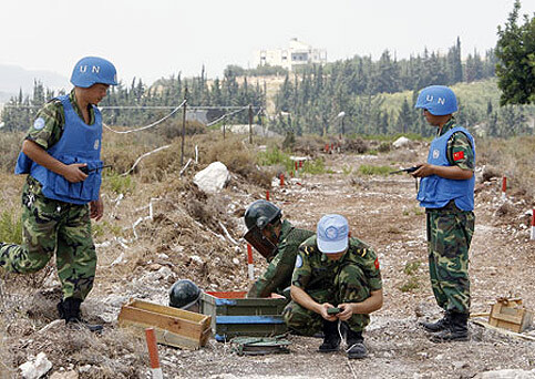 A United Nations Chinese battalion involved in the de-mining of the town of Hiniyah in Lebanon prepares to detonate unexploded ordnance. The peacekeepers first locate the unexploded devices, remove and relocate them to a safe area and then detonate them. 25 August 2006. (UN Photo/Mark Garten)