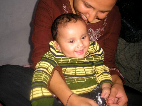 Five-month-old Eyad is one of the happiest babies I’ve ever met. Barely touch his cheeks and he smiles and giggles; tickle his little belly and he bursts out in laughter, kicking his feet up in the air. When he laughs, it involves his whole body, pushing out this loud giggly sound that’s full of happiness. Eyad doesn’t cry like other babies when he is alone. He just lies there quietly and plays with his hands and feet. But if he sees you, or senses you anywhere near him he starts to laugh again and kick his feet up in the air with excitement so you can play with him. Jamalat, his mother, says his laughter is a blessing from God for it fills her heart with joy and takes away some of her heartbreak and sorrow.