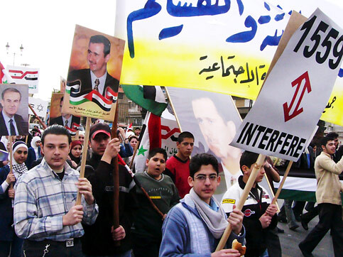 Syrians protest against UN Resolution 1559 that demands Damascus withdraw its army from Lebanon, a move Damascus called “foreign interference.” Analysts fear instability in the region. (Hugh Macleod/IRIN)