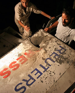 The Reuters silver colored Mitsubishi SUV carried “TV” and “Press” stickers in English and Arabic prominently across its doors, hood, and roof. And yet it was attacked more than once. Agency-France Press photographer Mohammed Abed who was driving behind Abed said the vehicle burst into flames after the second missile struck it. “I saw the body and head of my friend and colleague torn to pieces,” he said, visibly shattered by the loss.