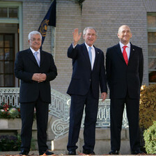 Mahmoud Abbas, George W. Bush and Ehud Olmert at the Annapolis summit, November 2007. (Omar Rashidi/MaanImages)